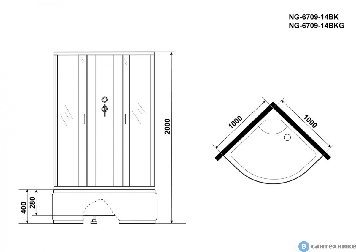 Душевая кабина Niagara NG-6709-14BKG (1000х1000х2000) высокий поддон (45см), стекло прозрачное, черные профиля (Китай) по
