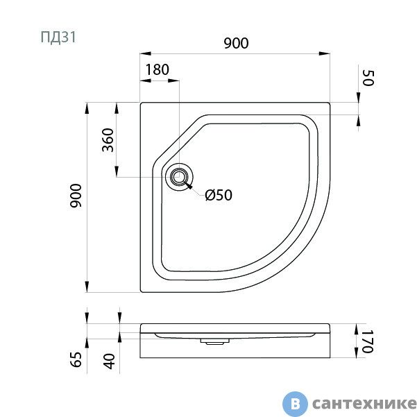 Душевой поддон Тритон ПД31 1/4 круга, низкий 90х90 с крышкой (Россия) по