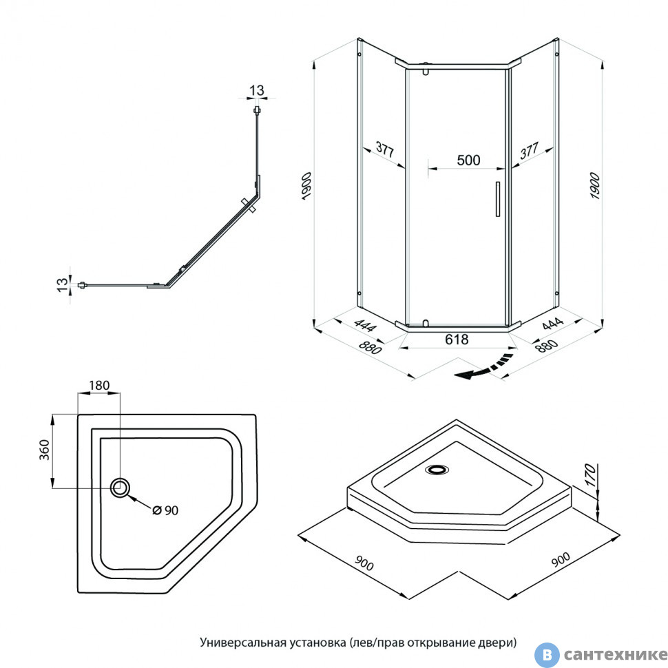 Душевое ограждение Тритон Дека-Хром, 90х90, пятиуг., низ. подд. (сифон D90 мм) (DK278) по
